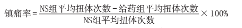 3. 扭體法:取雄性小鼠 40 只,禁食 12h 后(不禁水),隨機(jī)分為 6 組,分組及劑量同熱板法。給藥后60min左右,各小鼠腹腔注射0.6%醋酸0.1ml/10g(醋酸臨用前配制),觀察并記錄注射醋酸溶液后15min內(nèi)出現(xiàn)扭體反應(yīng)的次數(shù)(腹部收縮內(nèi)凹、伸展后肢、臀部扭轉(zhuǎn))。