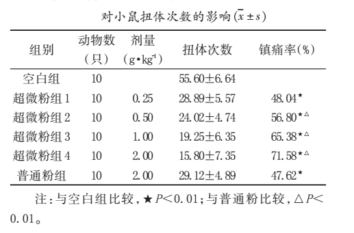 結(jié)果表明,落新婦超微粉和普通粉均能明顯提高小鼠的痛閾值(P<0.01),其中超微粉兩個(gè)劑量組(2g·kg-1、1g·kg-1)鎮(zhèn)痛作用明顯優(yōu)于普通粉組(P<0.01)。
