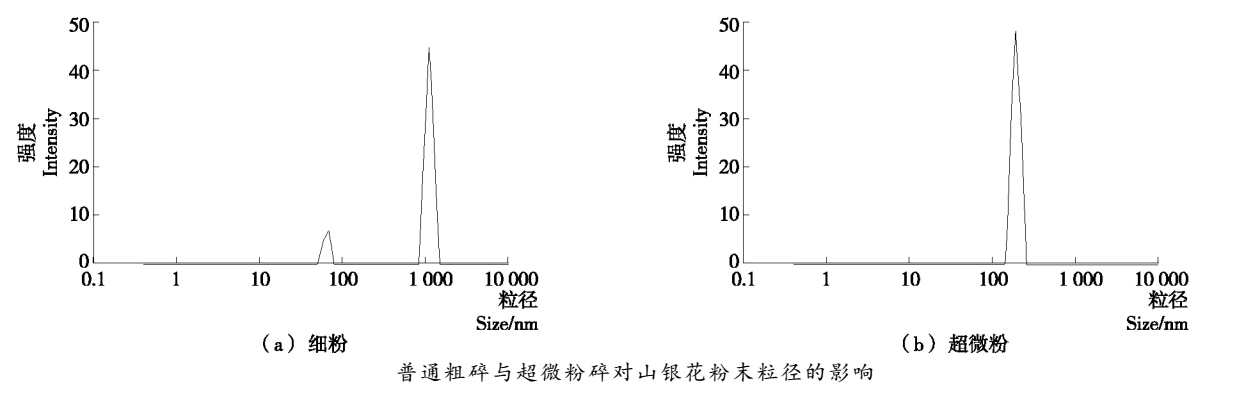 山銀花細(xì)粉形狀各異,粒徑較大,表面較粗糙。經(jīng)過超微粉碎后,山銀花原片狀結(jié)構(gòu)被切斷,呈現(xiàn)粒徑較小、形狀多為圓錐形或束形、纖維單個散在或數(shù)個成束的微粒結(jié)構(gòu)特性。由圖可知,經(jīng)過普通粉碎的山銀花顆粒分布范圍較廣,平均粒徑為3368nm(分散系數(shù)PDI為0.817),經(jīng)過超微粉碎的山銀花顆粒平均粒徑為535.5nm(分散系數(shù)PDI為0.540)。可見,經(jīng)過超微粉碎后,其粒徑分布區(qū)域變窄。研究發(fā)現(xiàn),超微粉碎通過剪切力改變了物料大小,未有效改變纖維的結(jié)晶結(jié)構(gòu),只是改變纖維的顆粒大小。經(jīng)超微粉碎后,粒徑減小,同時粉碎過程中纖維等大分子長鏈發(fā)生斷裂,使得羧基、羥基等基團(tuán)充分暴露出來,從而改善其物化特性。