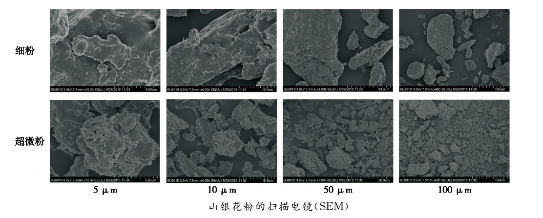 山銀花超微粉和細(xì)粉的掃描電鏡(SEM)如圖所示。