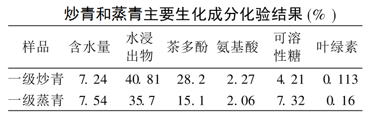 1. 由于加工工藝的差異,同等嫩度的炒青與蒸青綠茶的主要生化成分存在較大差異。