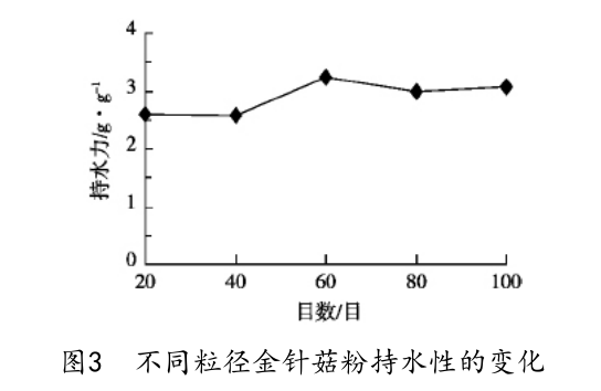 由圖3可以看出,隨著金針菇微粉粒徑的減小,粉體的持水能力逐漸增大。這是因為粉體粒徑越小,粉體的表面積越大,粉體內(nèi)部結(jié)合能力小于結(jié)合水的能力,持水力變大。由圖3可見,60目金針菇粉體具有較強(qiáng)的持水力。