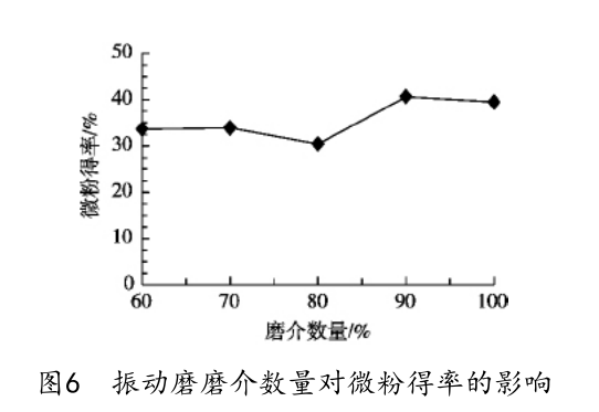 由圖6可以看出,當起始溫度25℃,進料含水量9.58% ,進料粒徑60目,粉碎時間10 min時,隨著磨介數量的增加,微粉得率逐漸增大。當磨介量為90%時,微粉得率達到最大值,故初步選擇磨介數量為90% 。