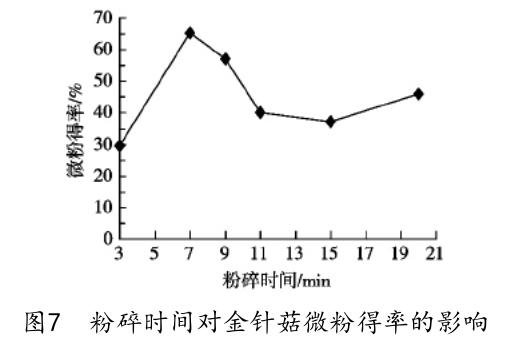 由圖7可以看出,當起始溫度25℃,進料含水量9.58% ,磨介數量80% 時,隨著超微粉碎時間的延長,微粉得率呈先升后降趨勢。在7 min時達到最大值。這是由于粉碎時間超過7 min后,金針菇細胞中的親水基團逐漸暴露,吸濕后產生團聚和粘附,使粉體粒徑變大,隨著超微粉碎的繼續(xù)進行,團聚粉體又被粉碎。因此,試驗初步確定超微粉碎時間為7 min。