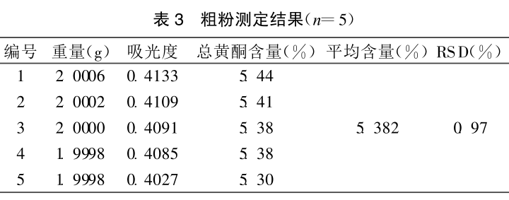 (2)粗粉含量測定 精密稱取5份趕黃草粗粉,分別按稱取5份超微粉,按精密稱取一定量的干燥超微粉于燒杯中(120℃干燥至恒重),按20:1的比例加入50%乙醇,攪勻后密封靜置4h,再超聲提取2次,每次40min,過濾,合并濾液,密封備用和按標(biāo)準曲線繪制項下的方法進行含量測定。結(jié)果見表3。