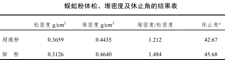 蜈蚣超微粉休止角略大于細粉,無明顯差異,說明蜈蚣超微粉和細粉流動性相差不大,但兩者的休止角皆大于 40 度,表明蜈蚣超微粉和細粉流動性較差。