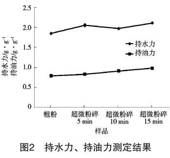 芒果皮超微粉的持水力和持油力結(jié)果如圖2所示,由圖可知,芒果皮粗粉持水力和持油力分別為1.85 g/g和0.79 g/g,超微粉15 min的持水力和持油力分別為2.11 g/g和0.98 g/g。超微粉隨著超微時(shí)間的增加,芒果皮超微粉粒徑的不斷減小,持水力和持油力提高,其中持水力更為明顯?赡茉蚴窃诔⒎鬯榈淖饔孟拢⒐さ慕M織結(jié)構(gòu)被疏松,顆粒的比表面積、表面能和孔隙率提高,并且在超微粉碎作用下部分細(xì)胞破碎,纖維素和半纖維素中更多的親水性基團(tuán)暴露出來,顆粒與水的接觸面積、接觸部位增多,其分散性增強(qiáng),因而持水力和持油力提高。