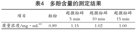 不同超微粉碎時(shí)間芒果皮多酚含量結(jié)果見表4,由表4可知,超微粉碎處理能明顯提高芒果皮多酚的含量,超微粉之間的多酚含量并未隨粉碎粒度的減低而升高,可能是超微粉碎對(duì)芒果皮結(jié)構(gòu),特別是纖維素結(jié)構(gòu)的改變,使芒果皮的多酚更有效的溶出。