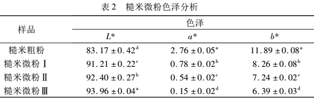糙米微粉色澤分析結(jié)果見表2.與糙米粗粉相比,隨著粉碎時間的延長,微粉的L*值顯著增大,a*值和b*值均顯著減小.一般谷物穎果的皮層或麩皮中含有維生素、植酸和少量色素,如花色苷和原花青素等植物色素,會使谷物食品的表面顏色較深,這與傳統(tǒng)觀念中精白米和面的白色不符,影響谷物食品的推廣.與普通精致白米相比,糙米顏色較深.但經(jīng)過超微粉碎處理后,微粉粒徑減小,糙米中的主要成分淀粉和蛋白質(zhì)也顯露出來,不同顏色的顆粒間相互混合,紅色和黃色均明顯減弱,微粉顏色更為白亮、更均勻,這將有助于改善糙米食品的色澤品質(zhì).