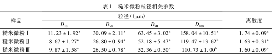 糙米食品開發(fā)與推廣的關(guān)鍵問題在于口感粗糙.研究表明對食品中顆;虍愇锏母兄饕煽谇煌瓿,口腔對顆粒粒度的感知閾約為50μm,如果能夠?qū)⒃狭6葴p小到50μm左右,將可以改善糙米食品的口感.糙米微粉粒徑分析結(jié)果見圖1和表1.因糙米粗粉顆粒粒徑超出粒度儀的測量范圍為0~350μm,表未給出糙米粗粉的粒徑參數(shù),但從圖1a中可以看出,糙米粗粉大部分顆粒粒徑都在150μm以上.從表1可知,糙米粗粉經(jīng)過10min超微粉碎后,平均粒徑D50減小到(30.09±2.11)μm,達(dá)到超微粉級別,表明振動式超微粉碎機(jī)對糙米全粉有著較好的破碎作用.繼續(xù)延長粉碎時間,微粉D50進(jìn)一步減小,但與粉碎10min時相比無顯著差異.D90已接近口腔對顆粒粒度的感知閾50μm,所得微粉用于食品開發(fā)將可以改善口感,這還需通過產(chǎn)品來進(jìn)行驗證.研究表明肉眼能夠感知的最小顆粒大約在100μm,顆粒的減小還能夠改善食品的表觀品質(zhì).離散度反映樣品粒徑的分布情況,離散度值小表示粒度分布范圍窄,過大和過小的顆粒較少,粉體較均勻.根據(jù)計算的離散度值可知,隨著粉碎時間延長,微粉離散度逐漸減小,但差異不顯著.從圖1b,c,d中也可以看出,3種微粉的粒徑分布圖基本一致,說明粉碎時間為20~30min時,已經(jīng)接近振動式超微粉碎機(jī)對糙米的粉碎極限.