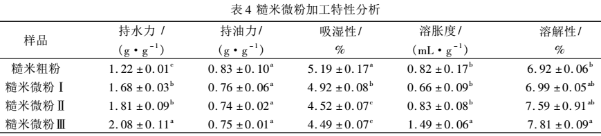 糙米微粉加工特性分析結(jié)果見表4.隨著粒徑減小,粉體比表面積增大,不僅增加了粉體與溶劑的有效接觸面積以及作用力,而且還縮短了溶劑分子進(jìn)入粉體內(nèi)部的距離,從而可以吸附和束縛更多的溶劑分子.與粗粉相比,糙米微粉的持水力顯著增加;同時,粒徑減小,樣品內(nèi)部的多孔網(wǎng)狀結(jié)構(gòu)破壞,其中的可溶性成分溶出,顆粒內(nèi)部空隙變大,對水和油的滯留能力也會降低.與粗粉相比糙米微粉的持油力和吸濕性降低,其中持油力變化不顯著.微粉的粒徑減小,暴露出更多的親水基團,微粉顆粒吸水膨脹產(chǎn)生更大的容積,使其溶脹度增加.當(dāng)粉碎時間為30min時,糙米微粉的溶脹度顯著高于粗粉.隨著樣品粒徑的減小,粉體與水的接觸面積增加,細(xì)胞被破碎使粉中的水溶性成分更易溶出,糙米微粉溶解性高于粗粉.