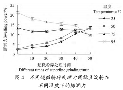 從圖 3 也可以看出,同一超微粉碎處理時(shí)間的綠豆淀粉樣品其溶解度隨著溶解溫度的升高不斷增加,加熱溫度越高,淀粉分子結(jié)晶區(qū)氫鍵被切斷的可能性越大,結(jié)晶結(jié)構(gòu)越易受到破壞,使得游離水更易于滲入淀粉分子內(nèi)部,溫度越高其溶解度也愈高。生淀粉分子靠分子間氫鍵結(jié)合而緊密排列,形成膠束,間隙很小,水分子難以滲透進(jìn)去,但是其水溶液經(jīng)加熱后,部分膠束被溶解形成空隙,水分子浸入內(nèi)部,與余下部分淀粉分子結(jié)合,膠束逐漸被溶解,空隙逐漸擴(kuò)大,淀粉顆粒因吸水而體積膨脹,導(dǎo)致淀粉膨潤(rùn)。不同超微粉碎處理時(shí)間對(duì)綠豆淀粉膨潤(rùn)力的影響見圖 4。