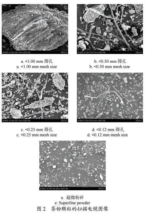 茶葉葉片由上下表皮、葉肉組織和形成葉脈的維管組織3部分構(gòu)成,維管束組織內(nèi)包括導(dǎo)管、篩管等結(jié)構(gòu)。掃描電鏡圖像能夠直觀反應(yīng)茶粉微觀結(jié)構(gòu),對比圖2可以發(fā)現(xiàn),常規(guī)粉碎茶粉組織結(jié)構(gòu)完整,<1.00 mm 茶粉顆粒較大,表面螺紋導(dǎo)管結(jié)構(gòu)清晰可見,其他3種粗粉顆粒中大塊顆粒逐漸變小、有許多散落的導(dǎo)管結(jié)構(gòu),組織結(jié)構(gòu)仍然完整。而超微茶粉呈現(xiàn)類似球狀的細小顆粒碎片,組織結(jié)構(gòu)和細胞壁被破壞。通過對比5種茶粉的組織結(jié)構(gòu)破壞程度可以反映出超微粉碎對茶葉葉脈組織和細胞壁的破壞程度更強。