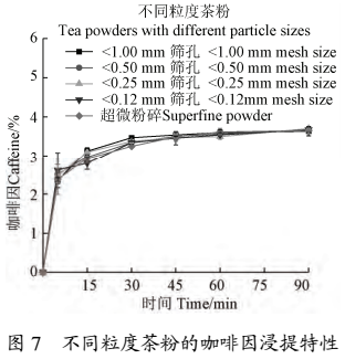如圖 7 所示,5 種粒度茶粉的咖啡因都隨時間快速、充分溶出,隨后達(dá)到平衡,平衡后各樣品的咖啡因含量差異不顯著。這是因?yàn)榭Х纫蛞兹苡?/span> 80 ℃以上的熱水,而在本試驗(yàn)沸水沖泡的條件下,5 種粒度茶粉中的咖啡因都可以充分溶出,故無顯著差異。