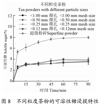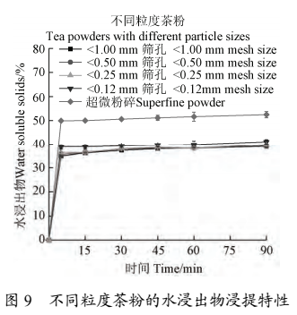 由圖 9 可以看出,水浸出物的含量隨著粉碎粒度的減小而升高,平衡后常規(guī)粉碎茶粉間水浸出物含量沒有顯著差異,而超微茶粉的水浸出物量顯著高于常規(guī)粉碎茶粉。