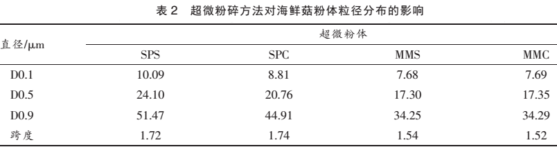 超微粉體的粒徑由激光粒度分析儀測出。其結(jié)果如表2所示。D0.1,D0.5,D0.9分別表示粉體粒徑小于某一值時累積率為10%、50%、90%,其中D0.5表示粒徑的中值,具有代表性。由表2可以得出,同一種原料(柄或帽)其平均粒徑為研磨粉碎顆粒(17.30~17.35μm)<剪切粉碎顆粒(20.76~24.10μm),經(jīng)剪切粉碎得到的粉體分布較為分散,粉體粒徑分布的寬度可用跨度表示,跨度越大,粒度越分散。從圖2可以明顯看出,海鮮菇研磨粉碎比剪切粉碎得到的粒度較小,粉末粒度更加均勻,用同樣方法制備的海鮮菇的柄和帽粉體未觀察到明顯差異。
