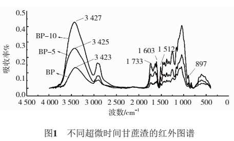 如圖1所示,897 cm-1處的吸收峰是纖維素中的β-D-葡萄糖苷鍵特征峰,1603 cm-1和1512 cm-1處是木質(zhì)素的芳環(huán)骨架吸收特征吸收峰,1733 cm-1處是半纖維素中的聚木糖特征吸收峰,振動超微粉碎后這些特征峰均沒有發(fā)生明顯的左右移動,圖譜中也沒有新的吸收峰產(chǎn)生。說明超微粉碎處理并沒有改變甘蔗渣主體成分和化學(xué)結(jié)構(gòu)。但隨著超微粉碎時間的增加,3 420 cm-1處附近的羥基特征峰向高頻方向移動,而且吸收峰變尖銳,這是由于甘蔗渣在經(jīng)過超微粉碎處理后,其分子內(nèi)氫鍵被打斷,且部分重新結(jié)合轉(zhuǎn)變?yōu)榉肿娱g氫鍵,羥基伸縮頻率升高,因而羥基的伸縮振動峰向高頻方向移動。采用實驗室自制的盤磨進行了預(yù)處理,其紅外圖譜結(jié)果同樣顯示羥基伸縮振動峰像高頻方向發(fā)生了移動,并認為是機械力使氫鍵斷裂并重新結(jié)合形成新的氫鍵的結(jié)果。