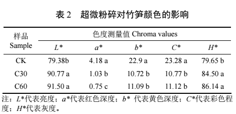 從表 2 可見 2 種超微粉各測量值非常相近,并且與粗粉有較大差異。超微粉的 L*值明顯升高,而b*則減小了將近一半,a*值也顯著減小,表明與粗粉的淡黃色相比,超微粉的黃色明顯下降,顏色更為白亮。測量過程中,粗粉的色度值變化較大,而超微粉的色度測量值變化波動較小,表明超微粉的顏色較均勻。因此,超微粉碎能很好改善竹筍粗粉顏色不均,偏黃偏暗的不足,相比于化學(xué)方法的漂白增白,純物理作用的超微粉碎更安全,對營養(yǎng)成分影響更小。超微粉色澤顯著改善主要由于其粒徑減小后,顆粒間混合更均勻,同時比表面積的增大,物料內(nèi)部會顯露出來,從而影響到物料的顏色。粒徑和顏色的均勻性是食品輔料的重要指標,竹筍超微粉均勻的粒徑和顏色,對于其外觀品質(zhì)有很大提高,使其更適合于作為主輔料應(yīng)用于食品加工中。