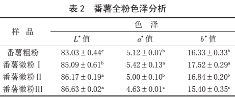 由表 2 可知,與粗粉相比,隨著粉碎時(shí)間的延長(zhǎng),番薯微粉的 L* 值增大,a* 值和 b* 值均呈現(xiàn)先增大后減小的變化趨勢(shì)。番薯塊根皮部分因含有花青素類(lèi)色素而呈紫色,塊根肉質(zhì)部分因含有胡蘿卜素而顯黃色。番薯皮因纖維素含量高,是最不易粉碎的部位。當(dāng)超微粉碎時(shí)間為 5 min 時(shí),主要是番薯皮顆粒粒徑在減小,紅綠值 a* 值和黃藍(lán)值 b* 值均有所增加;隨著樣品粒徑進(jìn)一步減小,樣品內(nèi)部的主要成分淀粉顯露出來(lái),顆粒間混合更均勻,微粉顏色更為白亮,彩色變淺,微粉顏色更均勻。