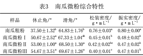 南瓜微粉綜合特性分析結(jié)果見表3。從表3可知,南瓜微粉的休止角、滑角均顯著大于粗粉,隨著粉體粒徑減小,顆粒的比表面積增大,顆粒間的引力和黏著力增加,使微粉的粉體流動(dòng)性減弱。隨著超微粉碎時(shí)間的延長(zhǎng),南瓜微粉的松裝密度和振實(shí)密度均逐漸減小。微粉粒徑減小,顆粒比表面積增大,顆粒間的空間也更大,能夠夾帶和吸附更多空氣,與粗粉相比更為膨松,松裝密度和振實(shí)密度均小于粗粉。