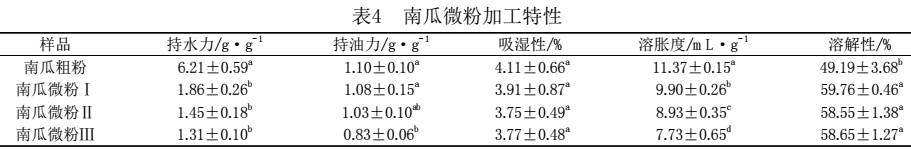 南瓜微粉加工特性分析結(jié)果見表4。從表4可知,隨著粉碎時(shí)間的延長(zhǎng),與粗粉相比,南瓜微粉的持水力和持油力均呈逐漸降低的趨勢(shì)。隨著樣品粒徑減小,樣品內(nèi)部的多孔網(wǎng)狀結(jié)構(gòu)破壞,膳食纖維結(jié)構(gòu)受到破壞,長(zhǎng)鏈斷裂,其中的可溶性成分溶出,對(duì)水和油的滯留能力均降低。與粗粉相比,南瓜微粉的吸濕性有所降低,但差異不顯著。隨著粉體粒度的減小,一方面,粉體的比表面積增加,增加了與水分子的接觸面積,又縮短了水分子進(jìn)入粉體中心的距離,使得吸濕量增加。另一方面,隨著微粉粒徑的減小,強(qiáng)烈的沖擊、碰撞、摩擦作用使得樣品內(nèi)部的多孔網(wǎng)狀結(jié)構(gòu)破壞,導(dǎo)致微粉滯留水分的能力降低。兩方面因素的共同作用導(dǎo)致南瓜微粉的吸濕性變化不顯著。微粉的粒徑減小,細(xì)胞被破碎使粉中的水溶性成分更易溶出,物料中大分子物質(zhì)長(zhǎng)鏈斷裂,對(duì)水分的束縛和吸附能力降低,導(dǎo)致溶脹度降低。另外,隨著粒徑的細(xì)化,南瓜微粉粉體與水的接觸面積相應(yīng)增加,有利于水溶性成分更充分的溶解,微粉溶解性顯著高于粗粉。