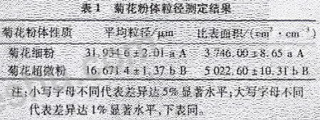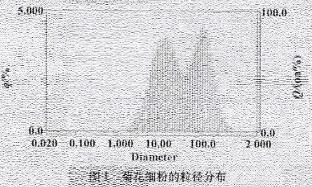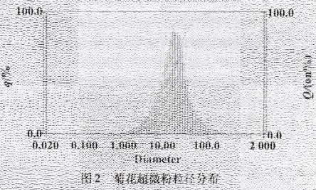 經(jīng)過普通粉碎的菊花細(xì)粉粒徑分布范圍較廣,粒徑分布集中在7.69—174.61μm之間(圖1),菊花經(jīng)超微粉碎后粒徑分布區(qū)域變窄,粒徑范圍相對集中,分布集中在5.86-39.23μm(圖2),對于顆粒粒徑來說,分布區(qū)域越窄,則顆粒的理化性質(zhì)越接近。