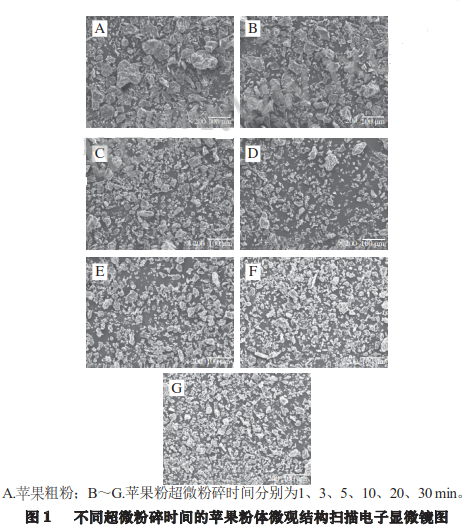 蘋果為薔薇科蘋果屬果樹(shù)。是飲食類黃酮和抗氧化劑的主要來(lái)源,富含VC和各種酚類化合物。若將干燥后的蘋果經(jīng)粗粉碎后,在不同粉碎時(shí)間(1、3、5、10、20、30 min)條件下經(jīng)低溫超微粉碎機(jī)粉碎,得到蘋果粗粉和6 種不同粒徑分布的蘋果超微粉,今天就來(lái)介紹一下蘋果粉體的粒徑分布和掃描電子顯微觀察情況。