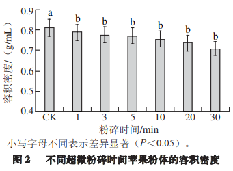 容積密度是反映粉體充填物性的重要指標(biāo)之一,粉體容積密度越大,說明粉體充填物性越好。由圖2可知,粗粉對照組的容積密度顯著大于不同超微粉碎時間的粉體(P<0.05),超微粉碎不同處理之間隨著粉碎時間的延長,蘋果粉體的容積密度下降,各處理之間差異不顯著(P>0.05)。超微粉碎1min后,蘋果粉體的容積密度從粗粉的0.81 g/mL降低至0.78 g/mL,超微粉碎30min時降低至0.70g/mL,超微粉碎降低了蘋果粉體的容積密度,這與楊磊磊、王萍等的實驗結(jié)果一致,但是與范明月等的實驗結(jié)果相反,這可能是因為粉末的容積密度不僅取決于顆粒大小,也與顆粒彼此之間的黏附趨勢有關(guān),實驗材料不同,不同粉體顆粒之間的引力和黏附趨勢有區(qū)別,所以會影響其容積密度值。超微粉碎后,蘋果粉體顆粒變小,顆粒比表面積增大,表面聚合能增加,顆粒流動性變差,更容易團聚成假的大顆粒使得粉體之間空隙率增大,從而導(dǎo)致容積密度減小。