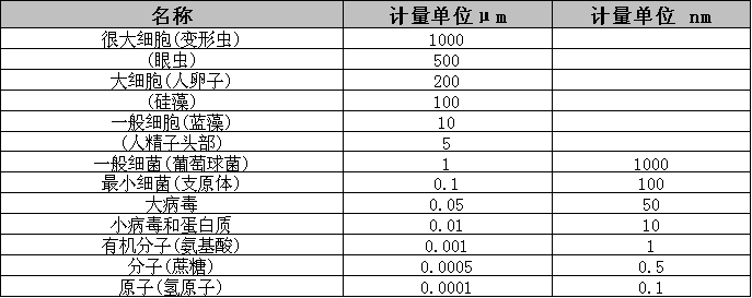 從表中可見,微細生物體的大小,從毫米級到微米級,計量單位反映了生物體尺度的大小范圍。