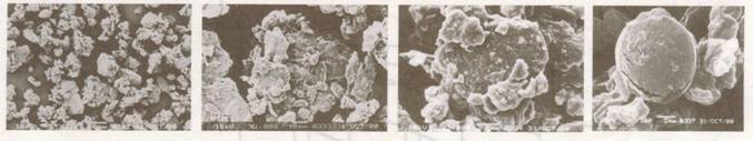 2、復方粉碎中的勻化作用。中藥大部分是復方,復方由各藥材組成,細胞破壁后,細胞內(nèi)的水份及油份遷出,使微粒子表面呈現(xiàn)出半濕潤狀態(tài),粒子和粒子之間會形成穩(wěn)定的粒子團(或稱之為微顆粒),每一個粒子團都包含相同比例的中藥成份。該粒子團的物理結(jié)構隨組份中各成份的HLB值(親水、親油平衡值)、延展性、破碎性、含水(油)率、比重等不同組合和不同的相互作用而不同。這種結(jié)構會使中藥材各有效成份均勻化,使各種成份均勻地被人體吸收,這也可以增強藥物的作用效果。見圖2中藥微粉團粒結(jié)構電鏡照片