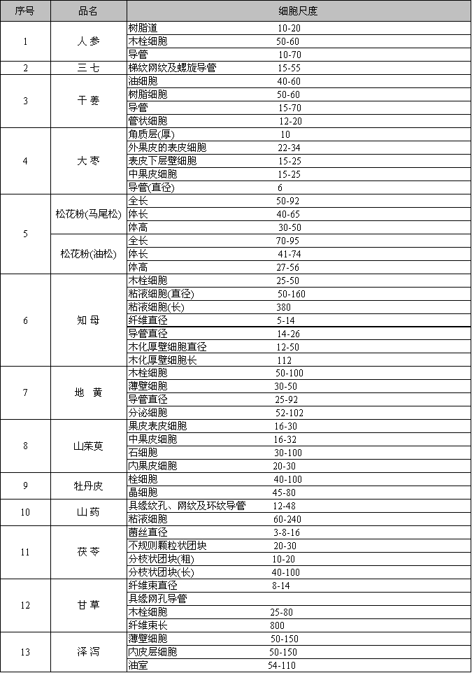 選取人參、三七、干姜、大棗、松花粉、知母、地黃、山藥、山茱萸、牡丹皮、茯苓、澤瀉、甘草等十三種中藥材,將《中華人民共和國藥典中藥材外形組織粉末圖解》一書中提供的藥材圖上標明的各種細胞尺度采集列表(圖上未有文字標出的細胞尺寸,按圖示比例測量得出)見表2《13種中藥材與細胞尺度相關的尺寸》及表3《13種中藥材與細胞尺度相關的尺寸列表》對表3分析可知:小于47μ的尺寸占58%,大于47μ的尺寸占42%,而小于10μ的尺寸,8μ、6μ、5μ、3μ都是長細胞的直徑。且占比例只有6%,因此細胞最小尺寸可按10μ確定。