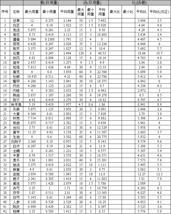 第一種:經(jīng)驗積累。以積上千年散劑使用的經(jīng)驗和古成方中散劑的用量用法為參考,在醫(yī)療實踐中摸索前進。如前面提到的對40味中藥散劑用量的統(tǒng)計那樣再深入廣泛的統(tǒng)計分析古成方散劑中藥物