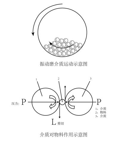 在外界激振力的作用下,磨介作時而散開、時而聚合的拋擲運動。磨介自身做同向自轉(zhuǎn),磨介群做公轉(zhuǎn)。內(nèi)外層磨介不斷交換位置,兩兩磨介不斷沖撞、擠壓剪切物料,使物料被擠破剪斷。顆粒由大到小不斷被破碎。在破碎過程中,較大顆粒先受力,先被破碎。