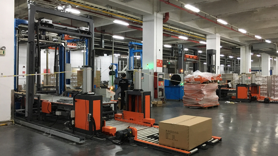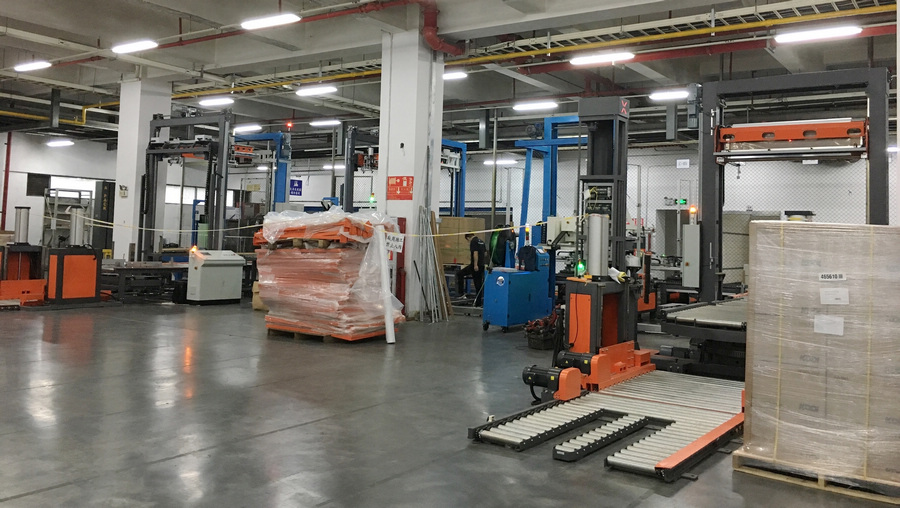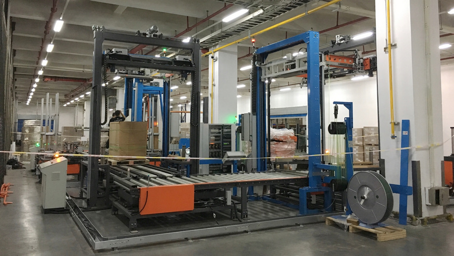 亞旭電子科技(江蘇)有限公司,是華碩集團(tuán)子公司,占地300畝,員工總數(shù)近萬人。此前,亞旭電子倉庫的貨物出庫前,需通過單機(jī)纏繞,再由人工進(jìn)行覆頂膜和手持打包機(jī)進(jìn)行打帶包裝,效率低且耗人工。