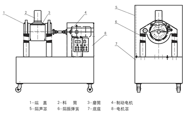 該設(shè)備采用振動粉碎的工作原理,在磨筒(粉碎室)中裝填一定量的研磨介質(zhì),如硬質(zhì)材料材料的球、棒或柱,磨筒在外加激振力的作用下產(chǎn)生順逆時針方向的圓振動。磨筒的強(qiáng)烈振動使磨筒內(nèi)的介質(zhì)產(chǎn)生拋擲運(yùn)動,在此拋擲運(yùn)動的作用下,使每個介質(zhì)都產(chǎn)生了與圓振動同向的旋轉(zhuǎn)運(yùn)動,與此同時,介質(zhì)群也產(chǎn)生3-5周與圓振動反向的低頻公轉(zhuǎn)運(yùn)動。于是介質(zhì)時而散開,時而互相沖撞,對物料產(chǎn)生正向沖擊力和側(cè)向剪切力。物料在P、L作用力的撞擊、壓縮和剪切作用下被研細(xì)、破壁粉碎。
